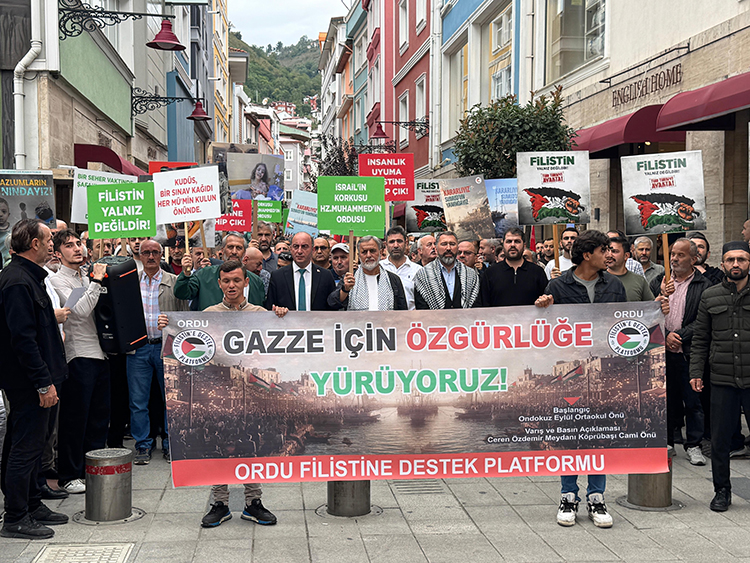 Ordu Filistin’e Destek Platformunca Altınordu ilçesindeki Sırrı Paşa Caddesi’nde düzenlenen etkinlikte bir araya gelen sivil toplum kuruluşu üyeleri ve vatandaşlar, Süleyman Felek Caddesi’nden Ceren Özdemir Meydanı’na yürüdü.
