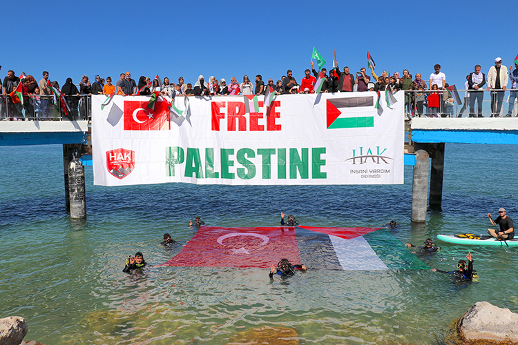 Programda dernek bünyesindeki su altı arama kurtarma dalgıçları da Van Gölü’nde Türk ve Filistin bayrakları açarak İsrail’in saldırılarını protesto etti.