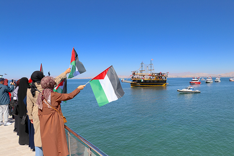 Van’da, İsrail ablukasını kırmak ve insani yardım ulaştırmak amacıyla Gazze’ye giden Küresel Sumud Filosu’na destek amacıyla bir araya gelenler, tekne ve kanolarla Van Gölü’ne açıldı, dalgıçlar da göle dalarak Türk ve Filistin bayrakları açtı.