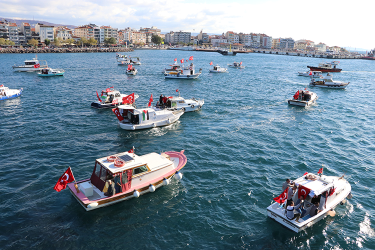 Etkinlik kapsamında Edremit İskelesi’nde bir araya gelen tur ve balıkçı tekneleri Türk ve Filistin bayraklarıyla donatıldı.