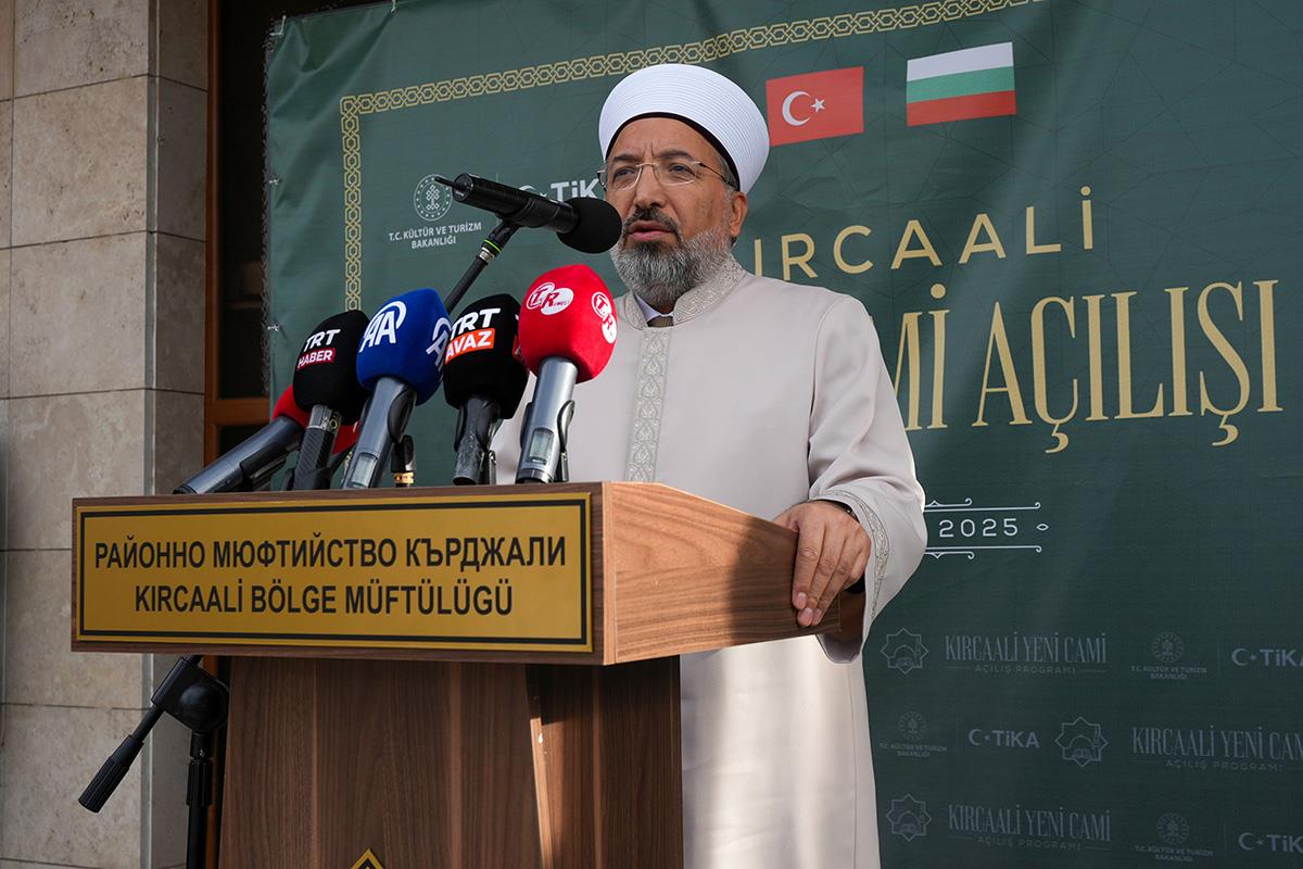 “Balkanlarda, Kırcaali’de böylesine görkemli bir caminin yapılmış olması, bizim için büyük bir anlam ifade etmektedir. Zira bu coğrafyada bulunan camiler, Kur’an-ı Kerim’in ve Sünnet-i Nebevi’nin insanlıkla buluşturulması hususunda geçmişten günümüze önemli görevler icra etmişlerdir. Yüce dinimiz İslam’ın hayat veren hakikatlerinin ve evrensel değerlerinin hayatla buluşturulmasında önemli fonksiyonlar icra etmişlerdir. Evlad-ı Fatihan yurdunda, günde beş vakit yankılanan ezanlarıyla bu mübarek mekanlar, asırlarca Müslümanlara kimlik, bilinç ve istikamet aşılamıştır.”