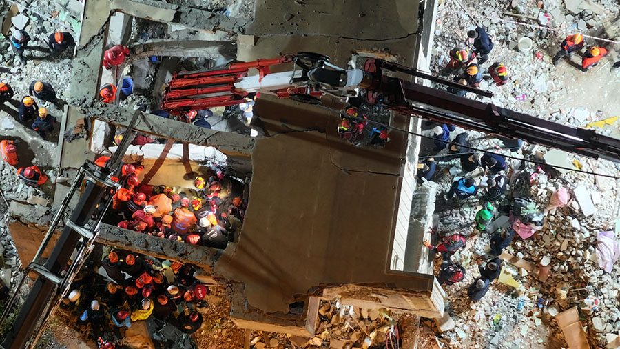 Yüzlerce kişiden oluşan arama kurtarma ekipleri, alandaki molozları kovalarla çıkarırken, beton bloklar vinç desteğiyle askıya alındı.