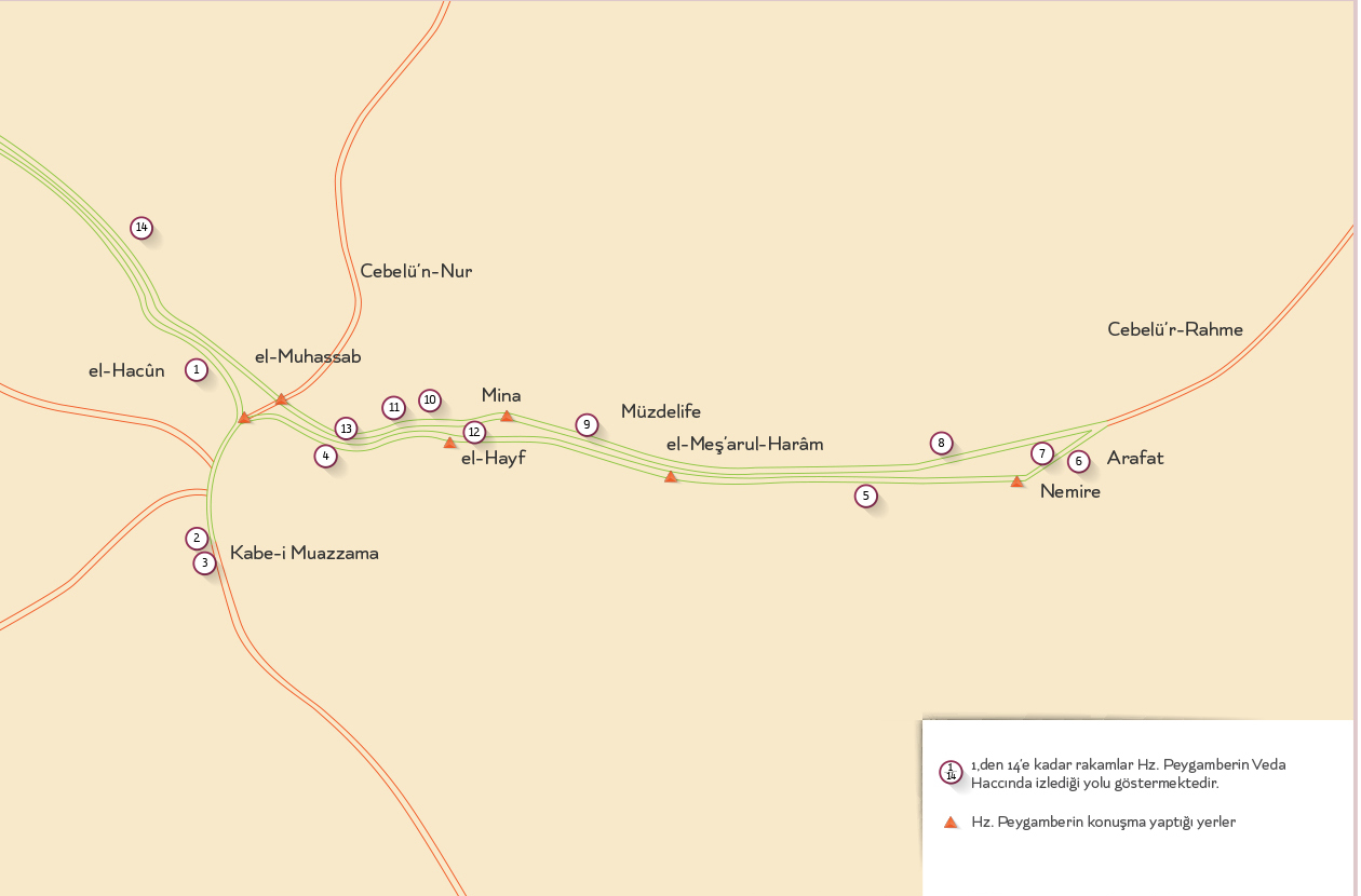8. Vedâ Haccı ve Hutbesi için bk.: Vâkıdî, III, 1088-1116; İbn Hişâm, II, 601 vd.; İbn Sa’d, II, 172-189; Taberî, III, 148 vd.; İbn Abdülber, Dürer, s. 259-268; İbn Seyyidinnâs, II, 359-368; Makrîzî, s. 510 vd.; Veda Hutbesi için ana kaynakları da gözden geçirerek Muhammed Hamidullah’ın mukayeseli metnini esas aldık ve sadeleştirdik. Bunun için bk. el-Vesâiku’s-Siyâsiyye, s. 360 vd.; İslam Peygamberi, I, 298-301.